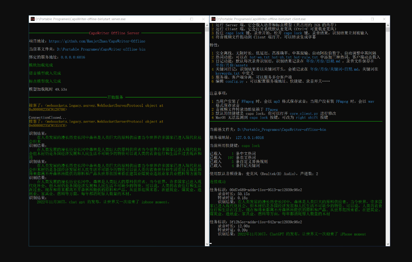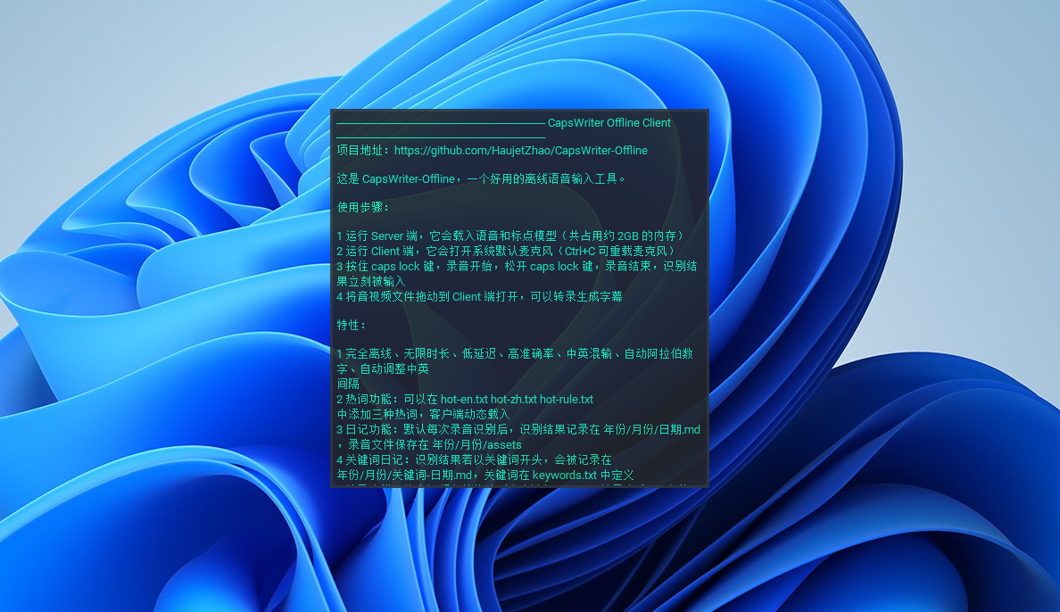 之前的 CapsWriter 用的是阿里云这类平台的语音转文本服务,而离线版本的 CapsWriter-Offline 用的是本地开源服务,核心优势就是完全免费、速度快,还不用担心隐私泄露。